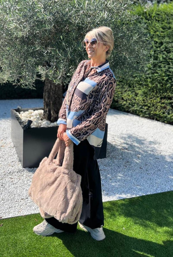 speciale bloes in tu met leoprint en blauw accent