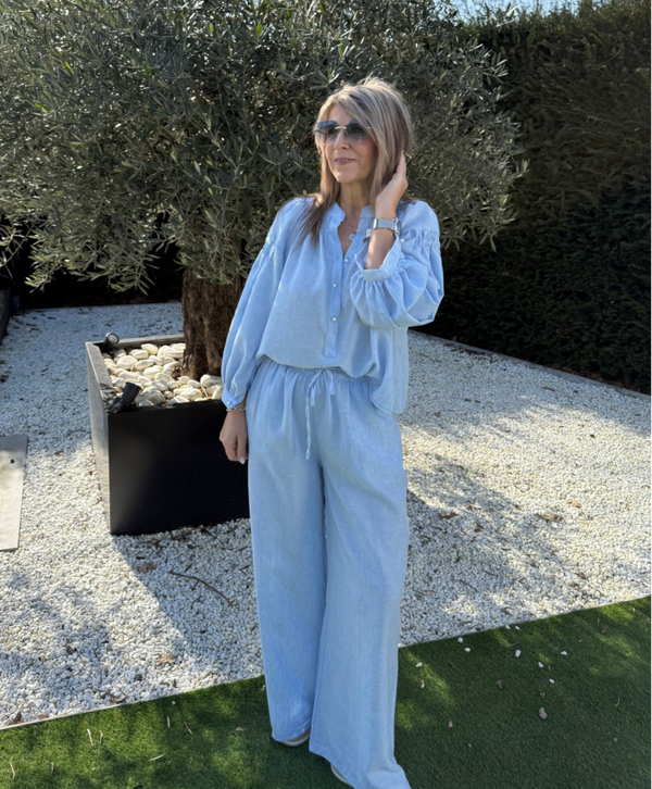 tu linnen blouse met vooraan parelknoopjes met bijpassende broek