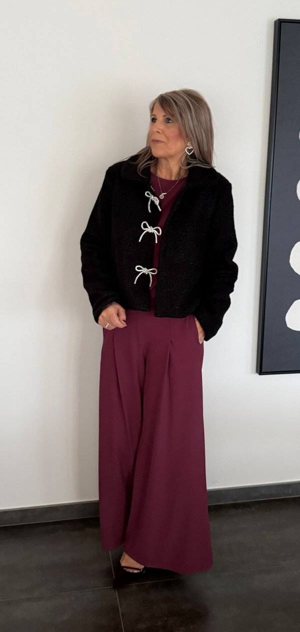Een elegant en toch stevige vest van bouclé-stof, afgewerkt met metalen strikjes in zilverkleur. De combinatie van de zachte, textuurrijke bouclé met de koele glans van metaal geeft het kledingstuk een luxe en opvallend karakter