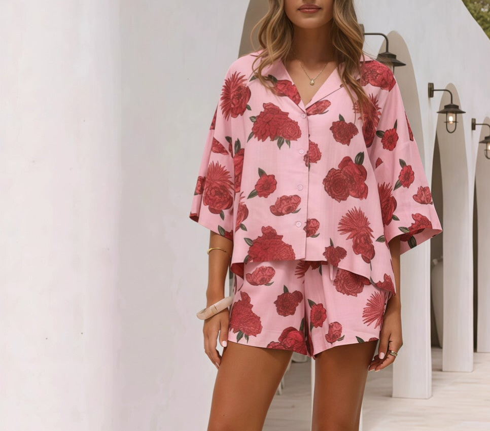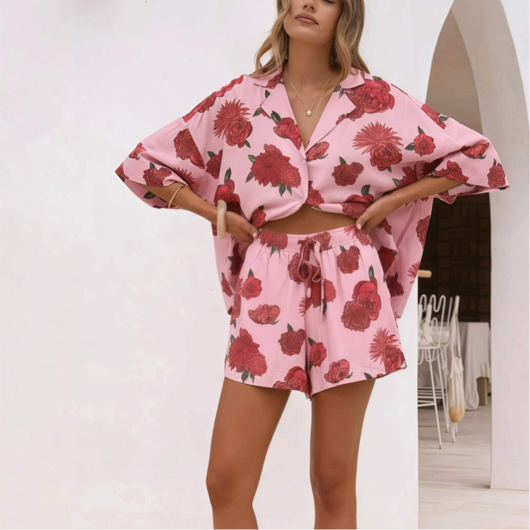 Setje blouse en short fuchsia rood